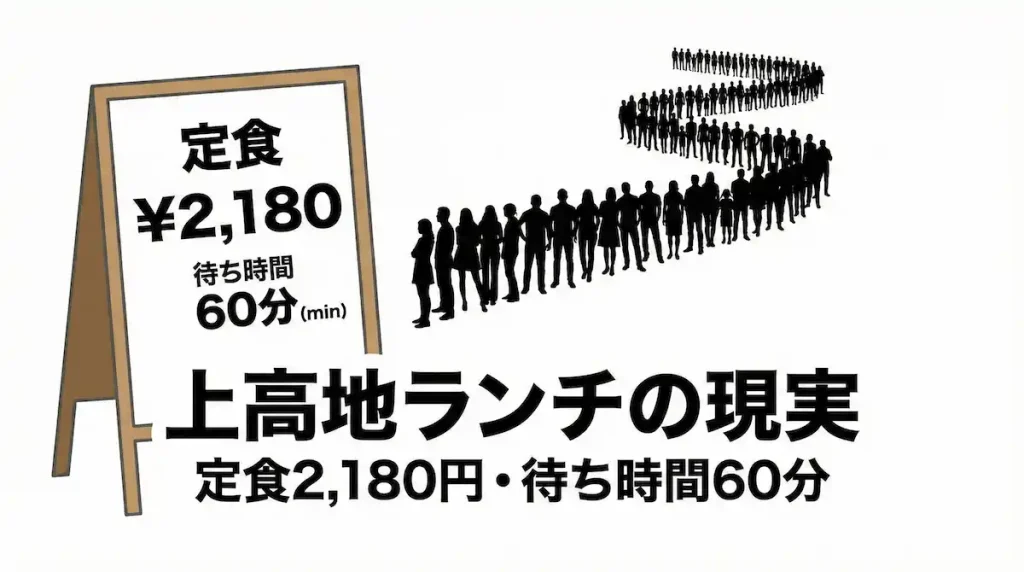 そう、実はこれ、多くの方が感じている悩みなんです。私も初めて上高地に行った時、レストランのメニュー表を見て「え、カレーで1,800円…?」と固まった記憶があります。さらに追い打ちをかけるのが、お昼時の大行列。せっかくの貴重な滞在時間が、並んで終わってしまうのは本当にもったいないですよね。