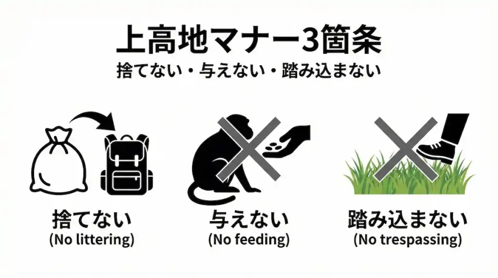 お弁当を持ち込むなら、絶対に守ってほしいルールがあります。上高地は国立公園であり、美しい自然を次の世代に残すためのルールが定められています。