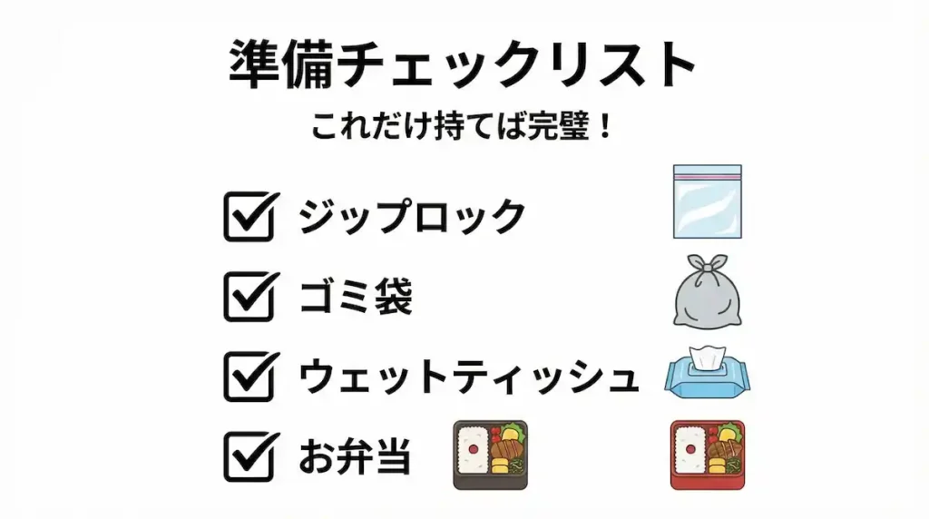 ジップロック(大・小)とゴミ袋を必ず持参してください。 食べ終わったお弁当箱は、すぐにジップロックに入れる。これで匂いも漏れも防げます。